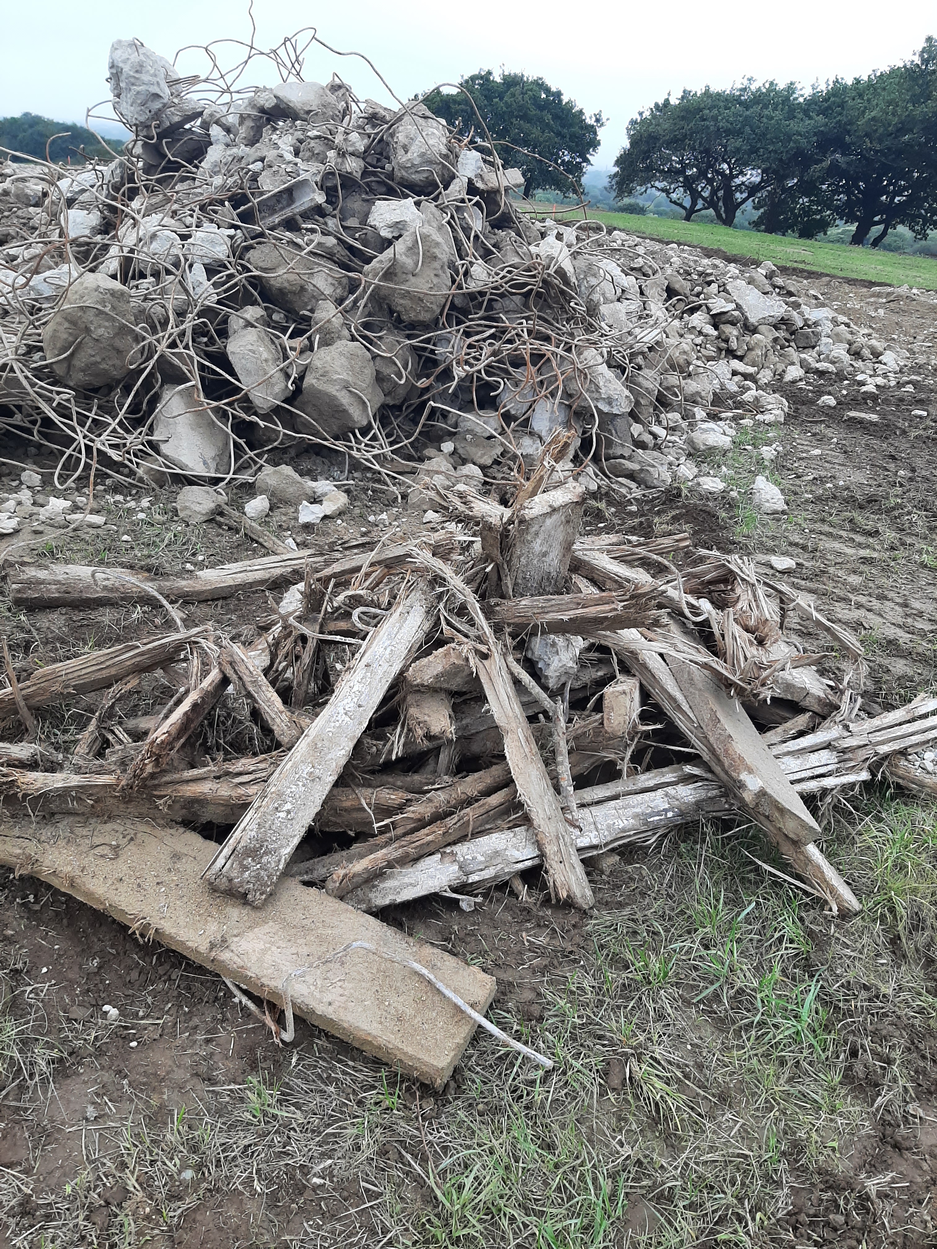 Vue de la déconstruction : matériaux (2 octobre 2022). Au premier plan : vestiges de poutre de bois du plafondImmatriculation