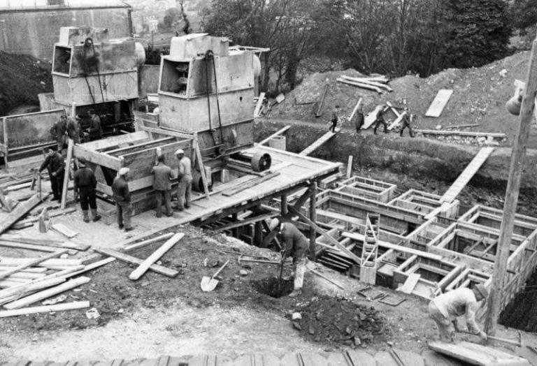 Exemple de chantier de construction d'un bunker à Brest (1 100 m3). Au centre, les deux bétonnières Regulus Großmischer (type B, 20 m3 ou C, 15 m3 ?) fabriquées par Seelemann & Söhne à Neustadt-Orla sont positionnées pour la coulée du bétonImmatriculation