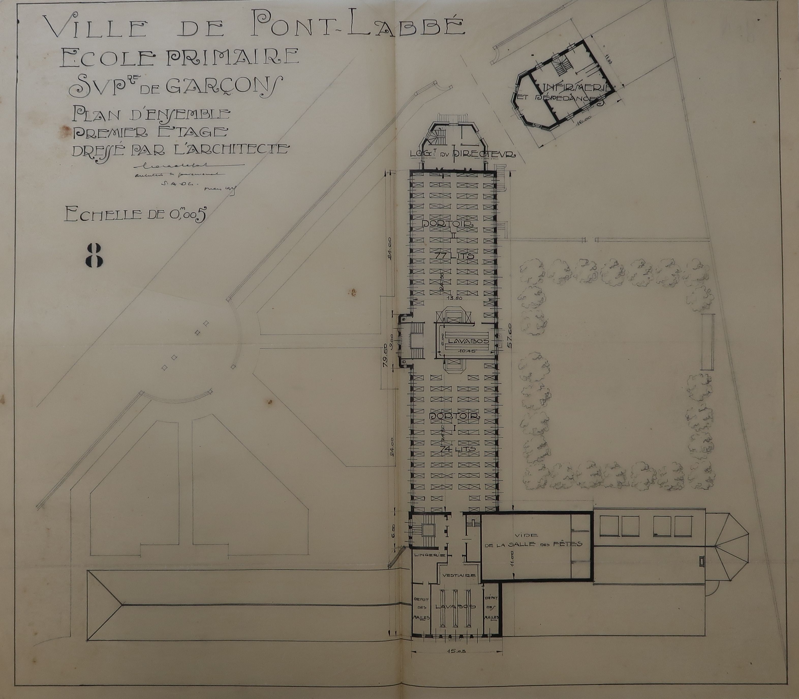 Archives départementales des Côtes-d'Armor : 124J186. Lefort [G-R.], Jeu de plans et dessins de l'école primaire supérieure de Pont-l'Abbé, 1925-1928.