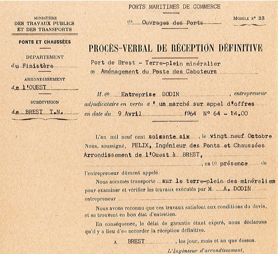 Procès-verbal de réception définitive par le Ministère des travaux publics et des transports du poste des caboteurs réalisé par l'entreprise A.Dodin (9/04/1964)Immatriculation