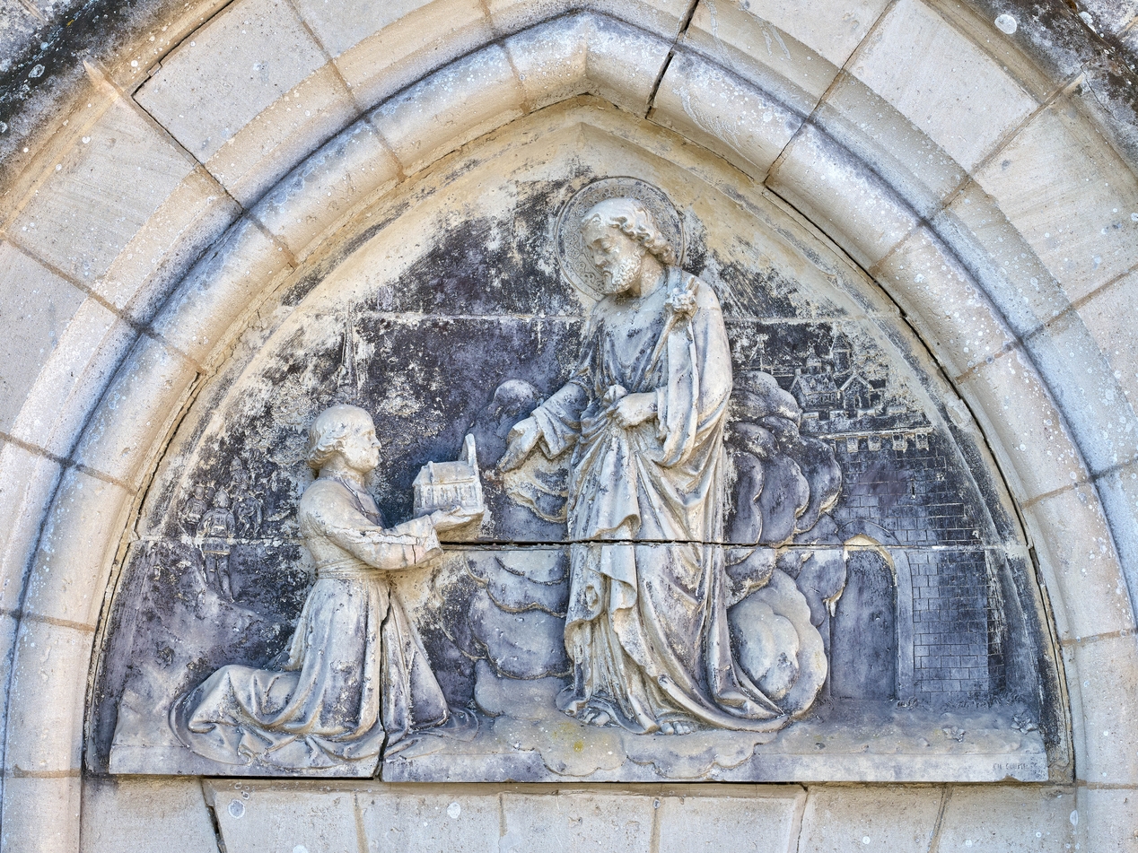 Tympan sculpté par Charles-Pierre Goupil : suite à son voeu, l'abbé Nantel offre la chapelle à saint JosephImmatriculation