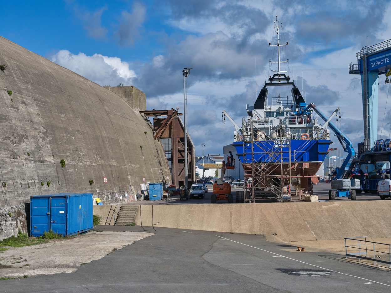 Dom-bunker Ouest T6 avec encuvement pour canon antiaérien puis dit dit bunker-cathédrale usine de construction navale, aire de réparation navale, port de pêche de Keroman (Lorient),