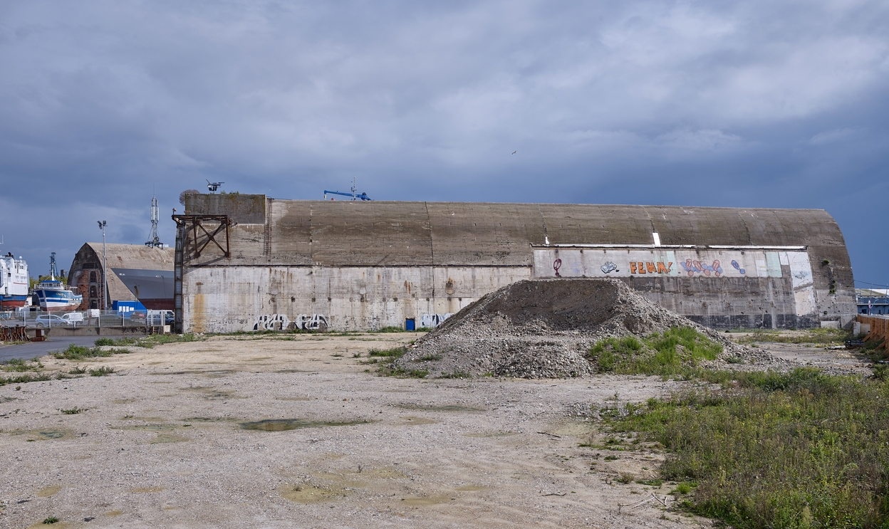 Dom-bunker Ouest T6 avec encuvement pour canon antiaérien puis dit dit bunker-cathédrale usine de construction navale, aire de réparation navale, port de pêche de Keroman (Lorient),
