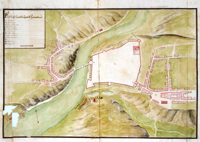 « Plan de la ville et port d'Hennebont », in Christophe-Paul de Robien (1698-1756), Description historique, topographique et naturelle de l'ancienne Armorique, Ms 0310/II, planche 25, 1756, 59 x 45, aquarelle