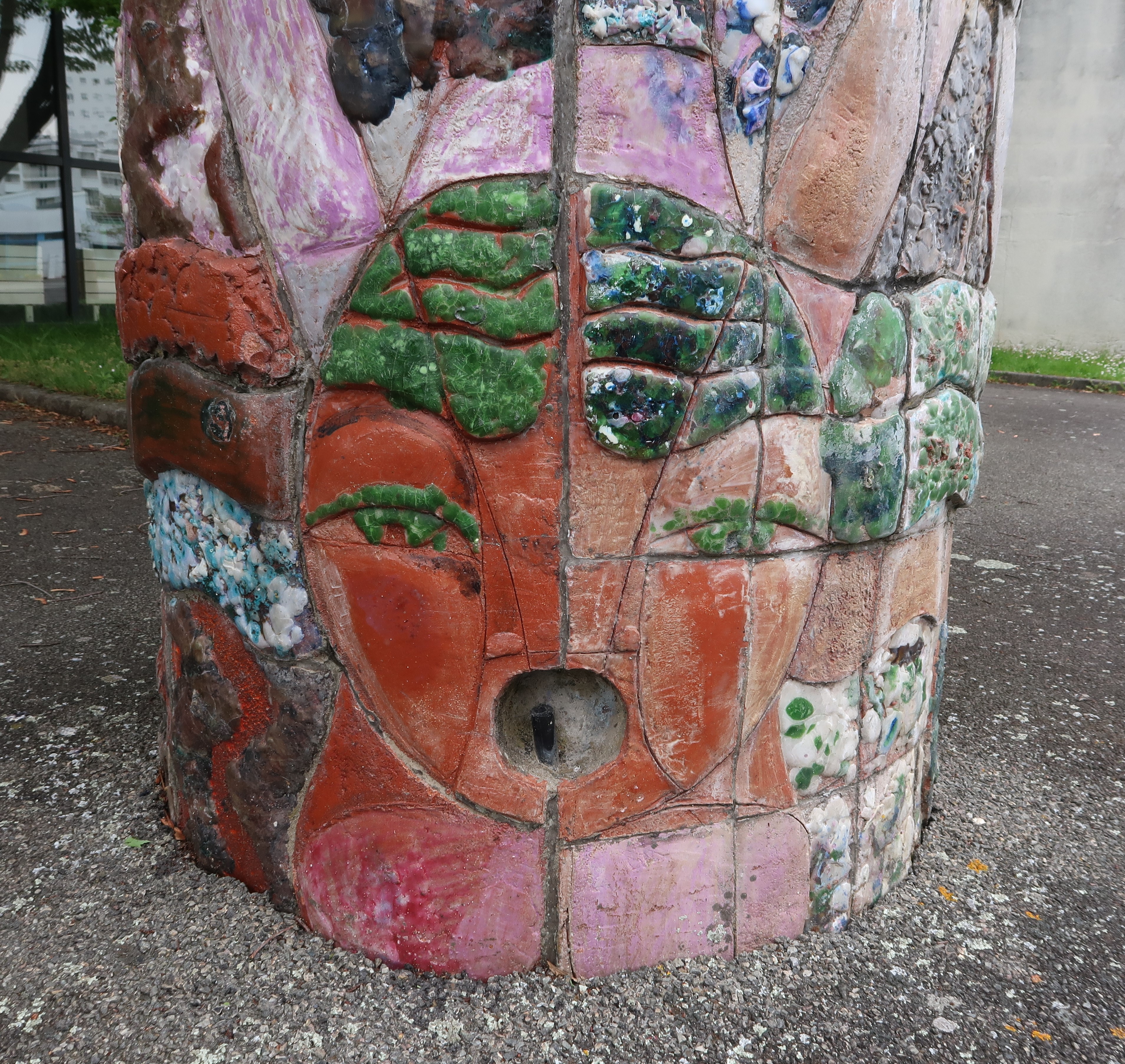 Claudine Henry, totem en béton et céramique (1968). Détail. Noter l'une des trois "possibilités de sorties d'eau" : "sortant de la bouche de l'Ondine".Immatriculation