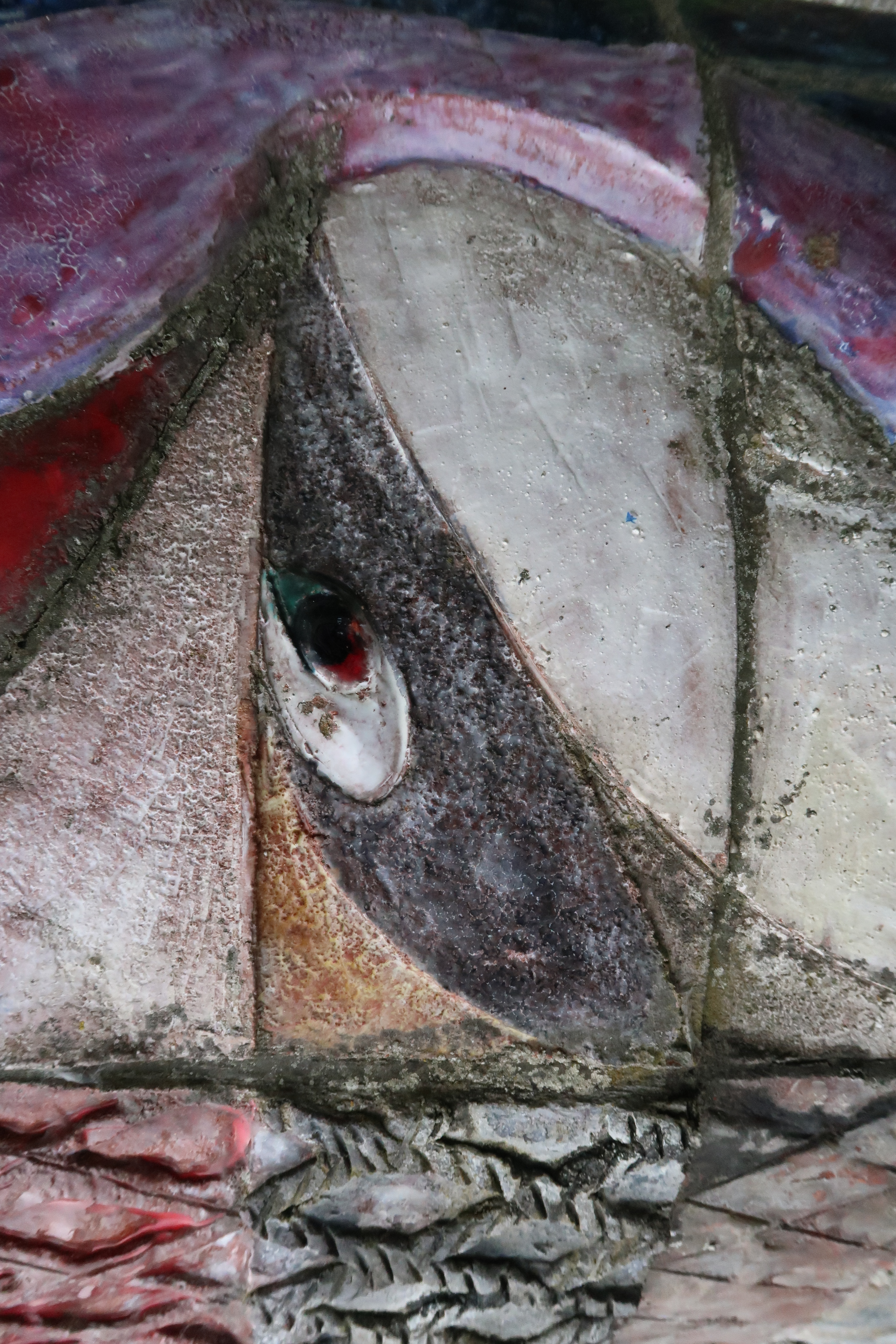 Claudine Henry, totem en béton et céramique (1968). Détail.Immatriculation