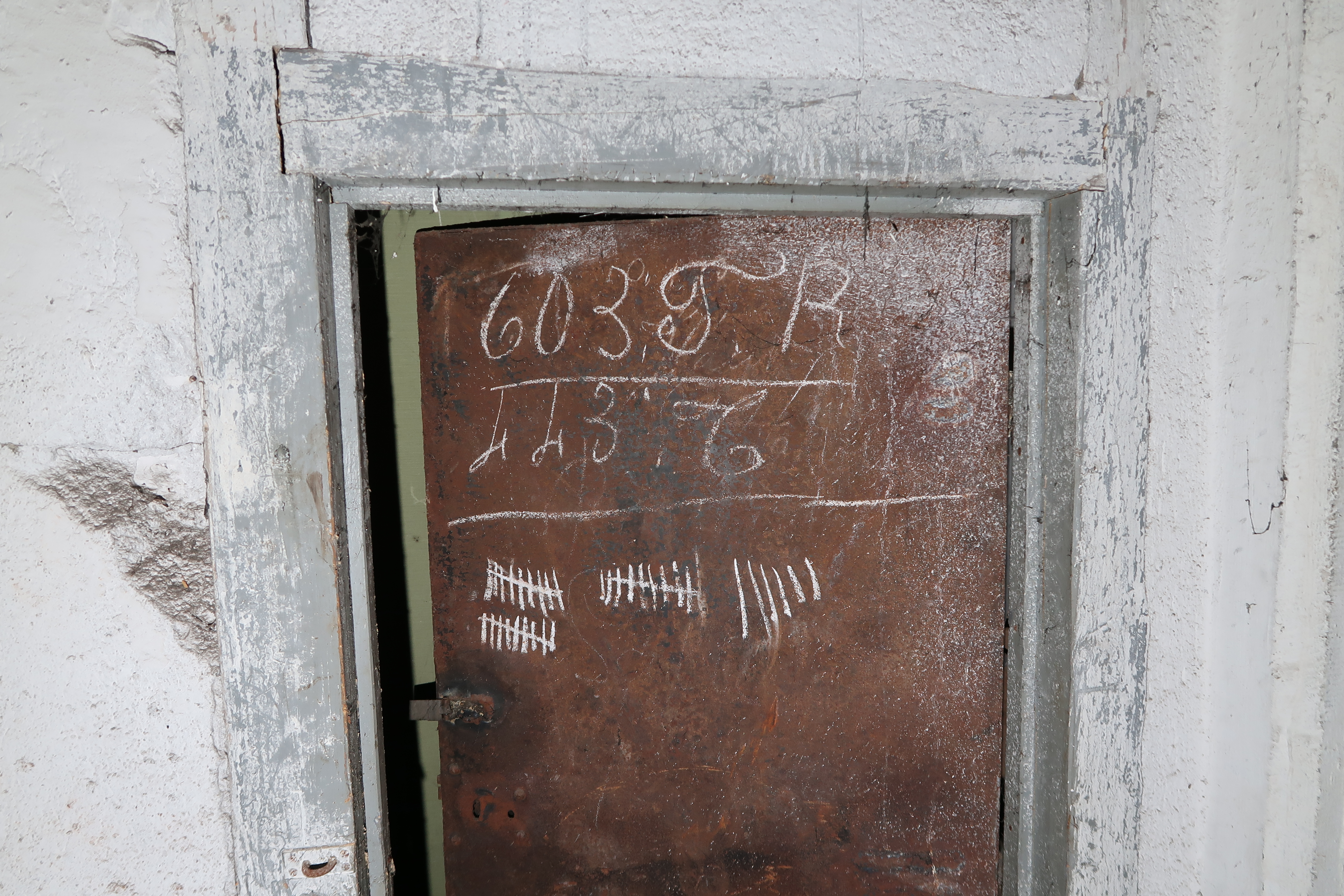 Premier étage : porte portant des inscriptions à la craieImmatriculation