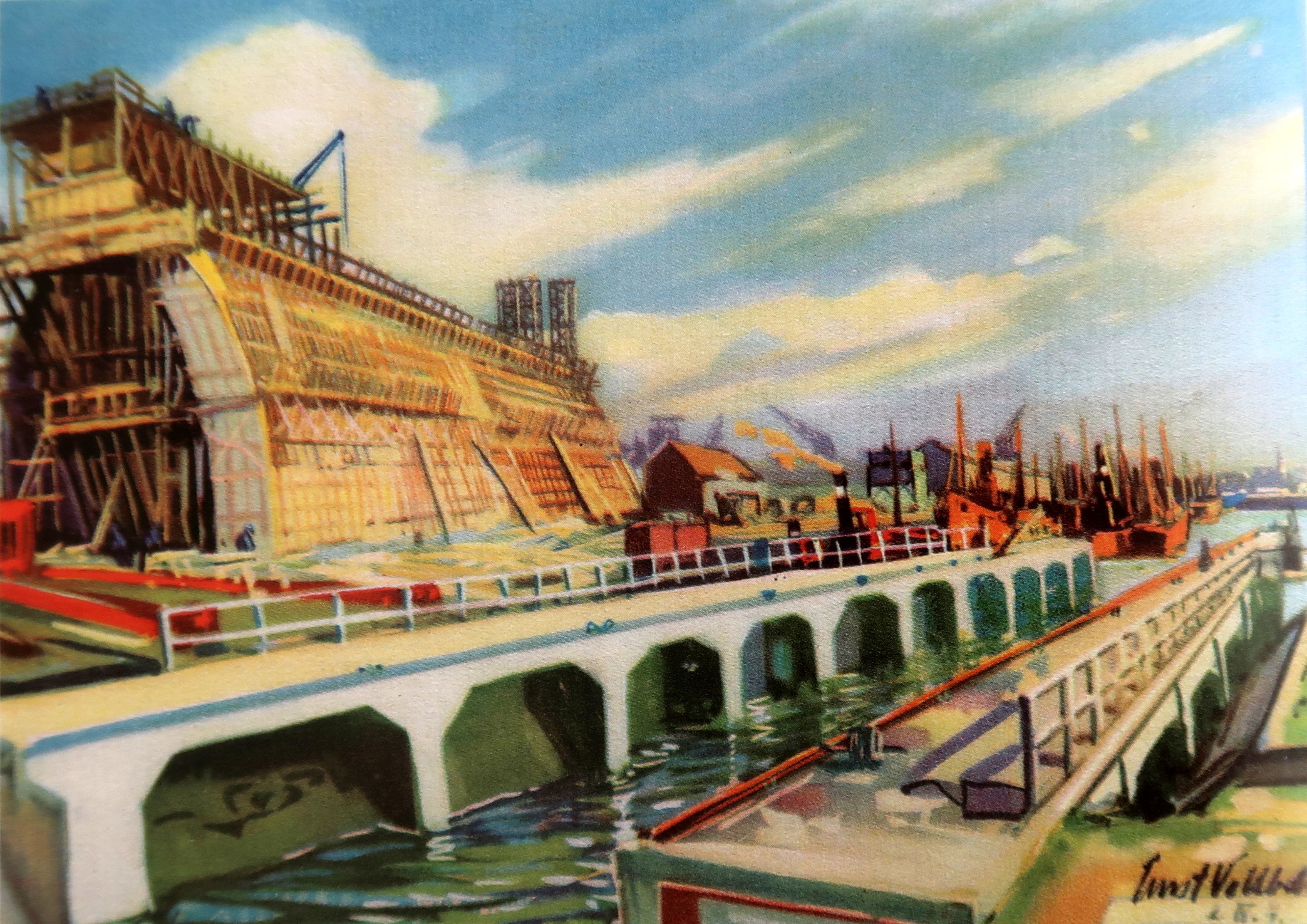 Tableau de Ernst Vollbehr représentant la construction du Dom-Bunker Est depuis l'ouest-nord-ouest, 2 avril 1941. Au premier plan, la rampe du slipway. Artiste peintre allemand (1876-1960), Ernst Vollbehr travaille pour la propagande du IIIème ReichImmatriculation