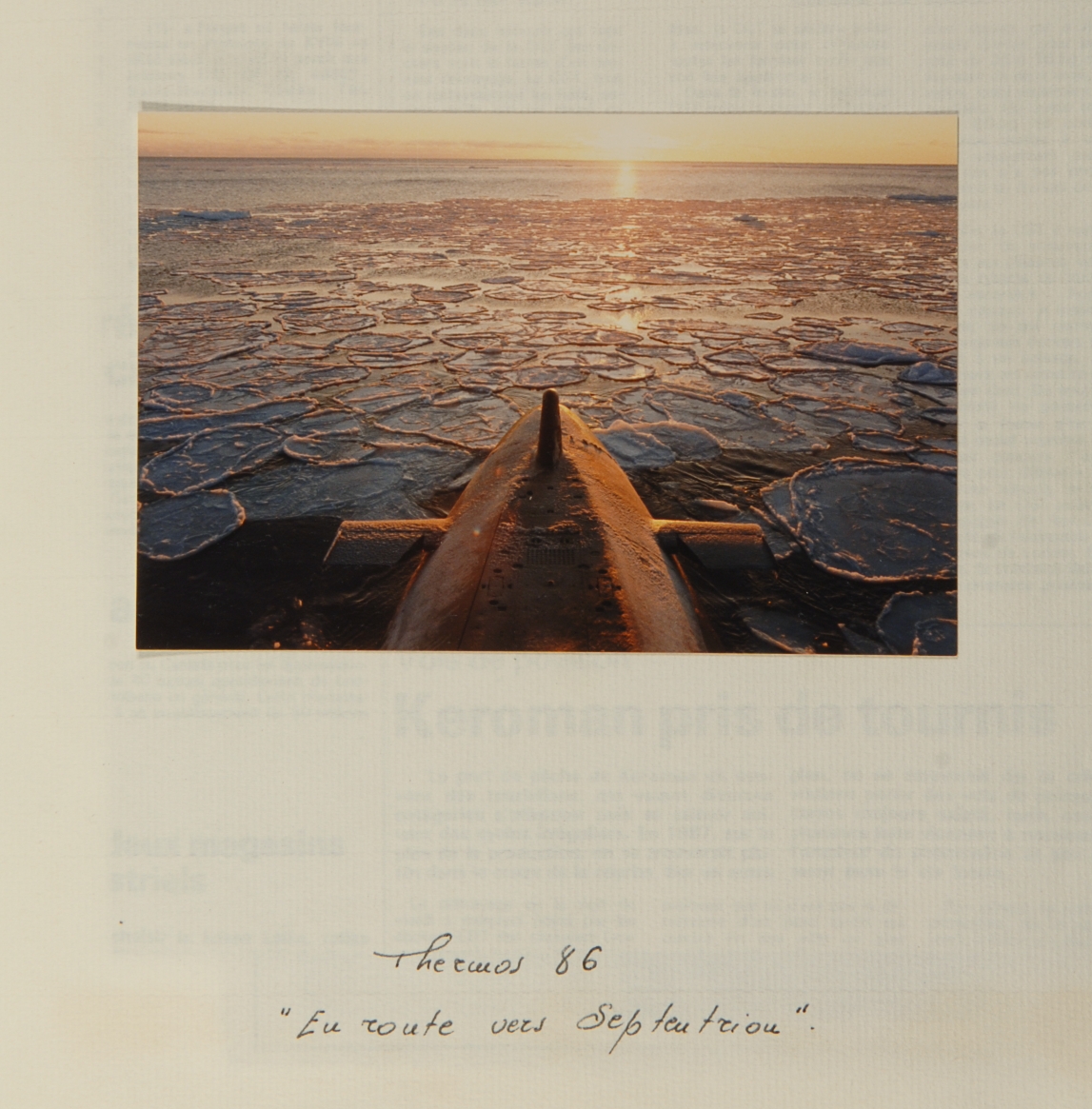 Le sous-marin Agosta dans la mer de glace, 1986, extrait du livre d'or du sous-marin Agosta. Transcription : "Thermos 86, En route vers Septentrion"Immatriculation