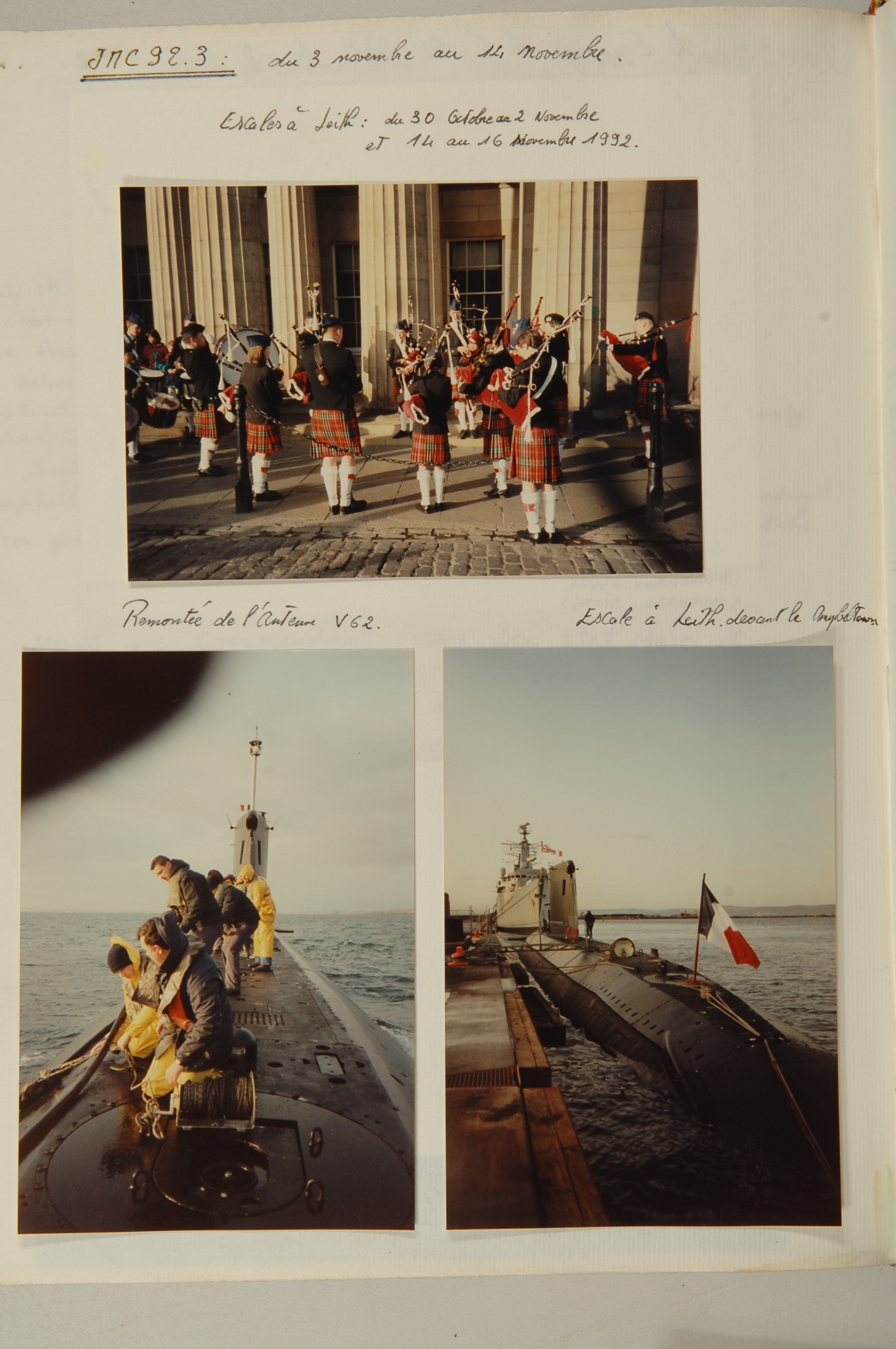 Escales du sous-marin Agosta à Leith à Édimbourg en Écosse du 30 octobre au 2 novembre et du 14 au 16 novembre 1992 ; remontée de l'antenne V62 ; escale à Leith devant la frégate HMS Campbeltown (sortie de la flotte en 2011), extrait du livre d'or du sous-marin AgostaImmatriculation