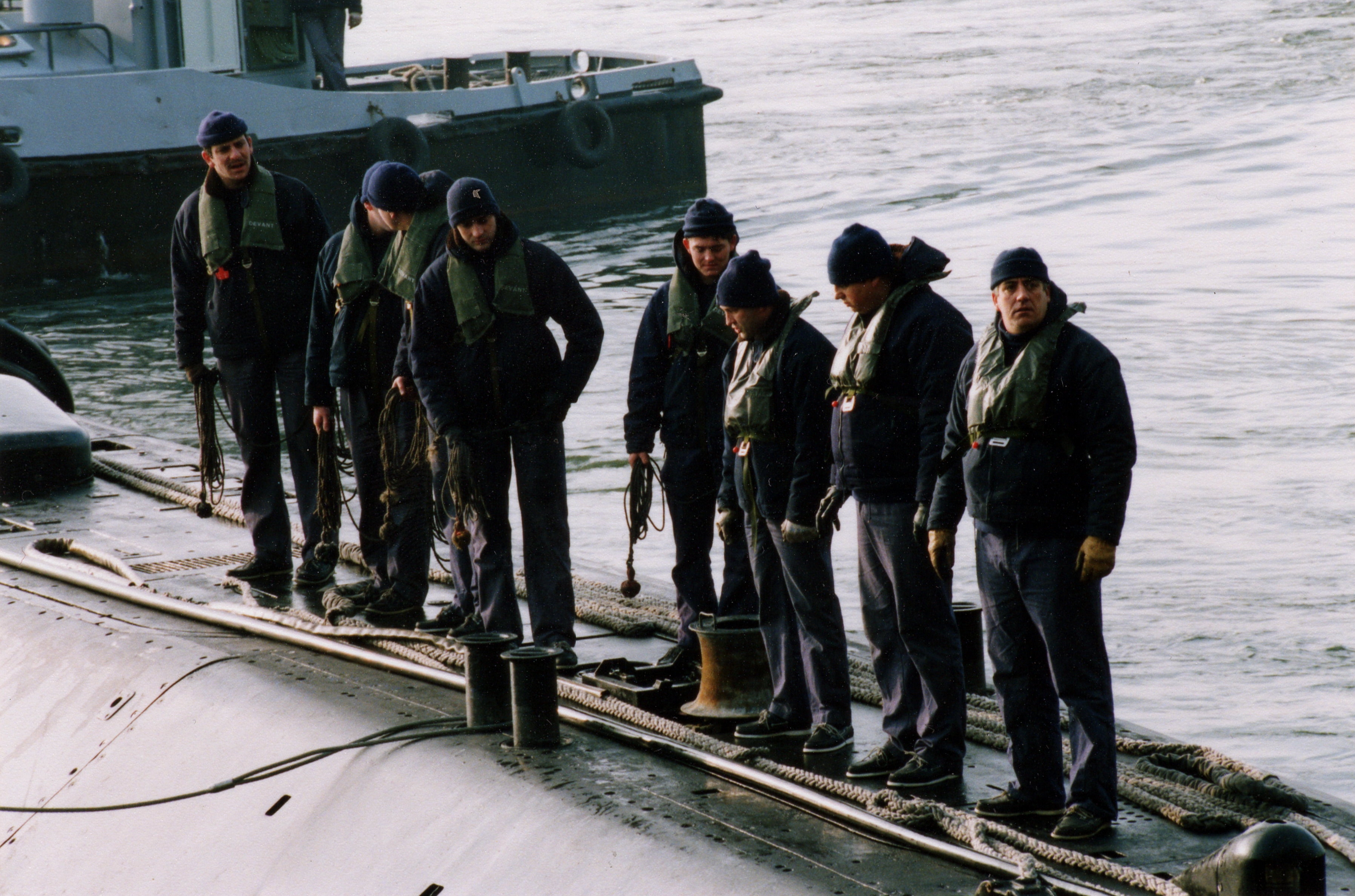 Le sous-marin Agosta arrive à la base de sous-marin de Keroman : membres d'équipage avec leur gilet de sauvetage sur la plage avant du pont parés à l'accostage, photographie non datée. Les amarres sont disposées sur le pontImmatriculation