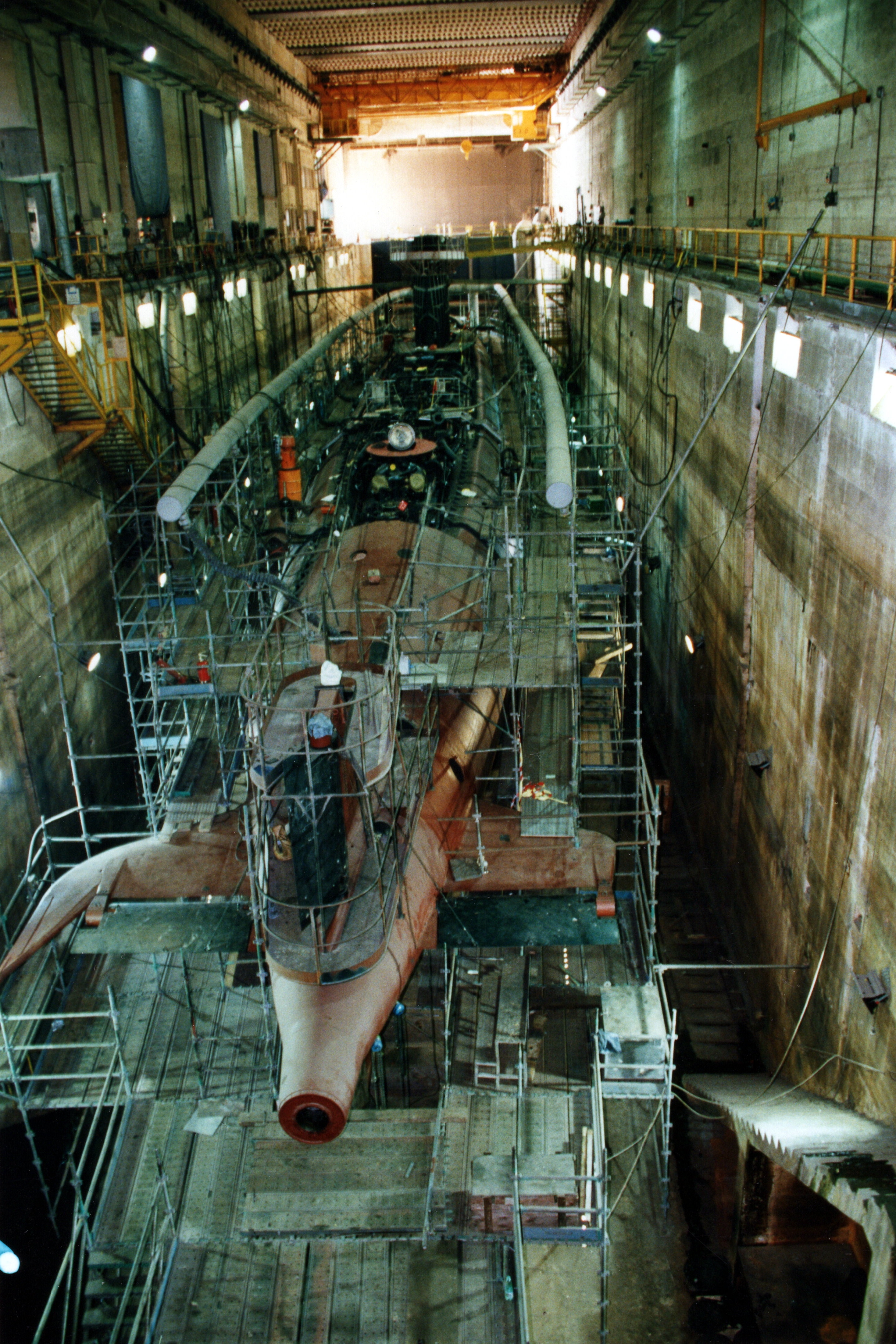 Vue du sous-marin Agosta en grand carénage dans l'alvéole A du bunker Keroman III à Lorient (1991-1992 ?)Immatriculation