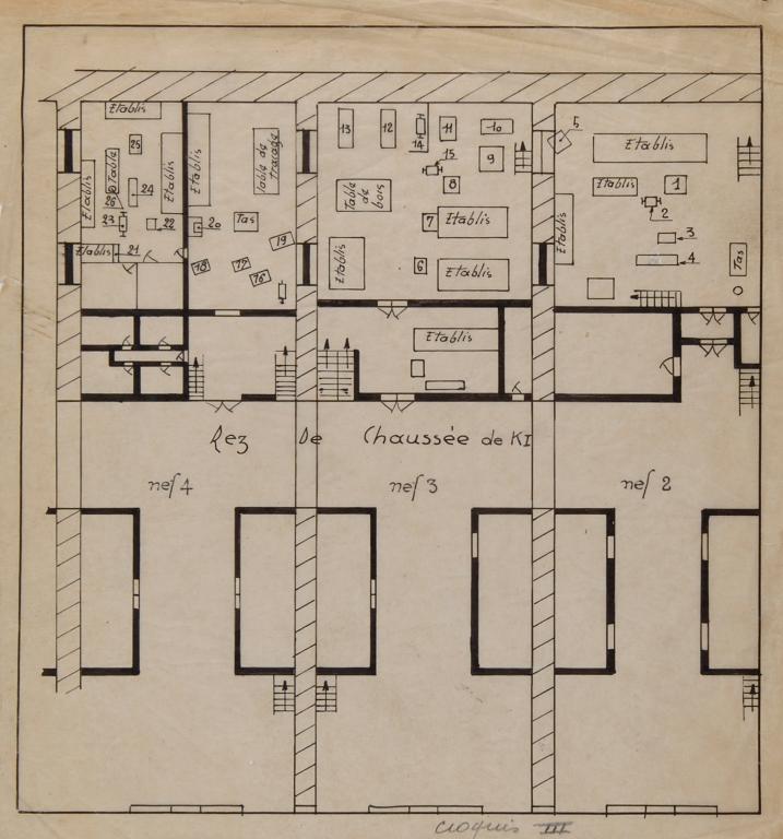 Plan des ateliers des alvéoles n° 2, 3 et 4 du bunker "KI", rez-de-chaussée, croquis III (Service Historique de la Défense de Lorient, Monographie de la base "Ingénieur Général Stosskopf", 1945-1946)Immatriculation