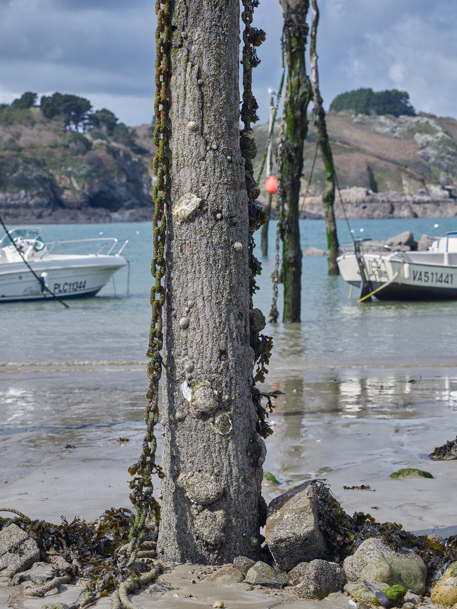 Détail des troncs d'arbre formant mouillage.Immatriculation