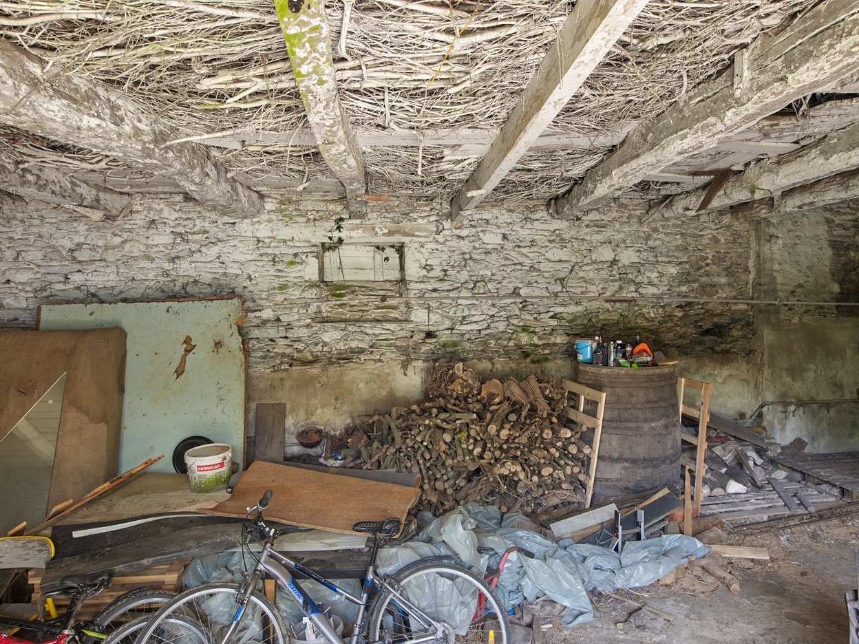 Remise sud-ouest. Vue intérieure du rez-de-chaussée et son plafond isolé avec des branchages.Immatriculation