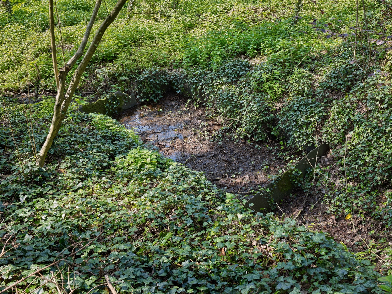 Lavoir divisé en deux bassins, construit en palis de schiste posés sur chant. Vue généraleImmatriculation