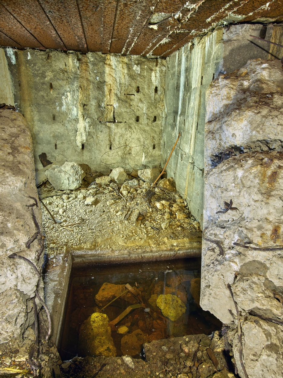 Vue de la pièce de vie - chambrée Nord : ce mur dont le béton est en très mauvais état, était situé directement face à la porte du sas d'où est venue l'explosion... Au sol, grande niche (inondée) aménagée entre les deux pièces de vie - chambréesImmatriculation