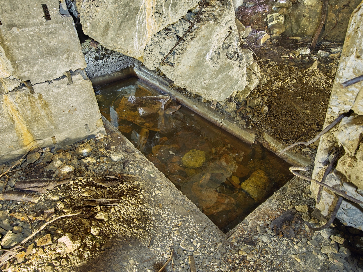 Vue de la grande niche (inondée) aménagée dans le sol entre les deux pièces de vie - chambrées. La feuillure de 5 cm d'épaisseur permettait d'y installer un plancher... Sa fonction est inconnueImmatriculation