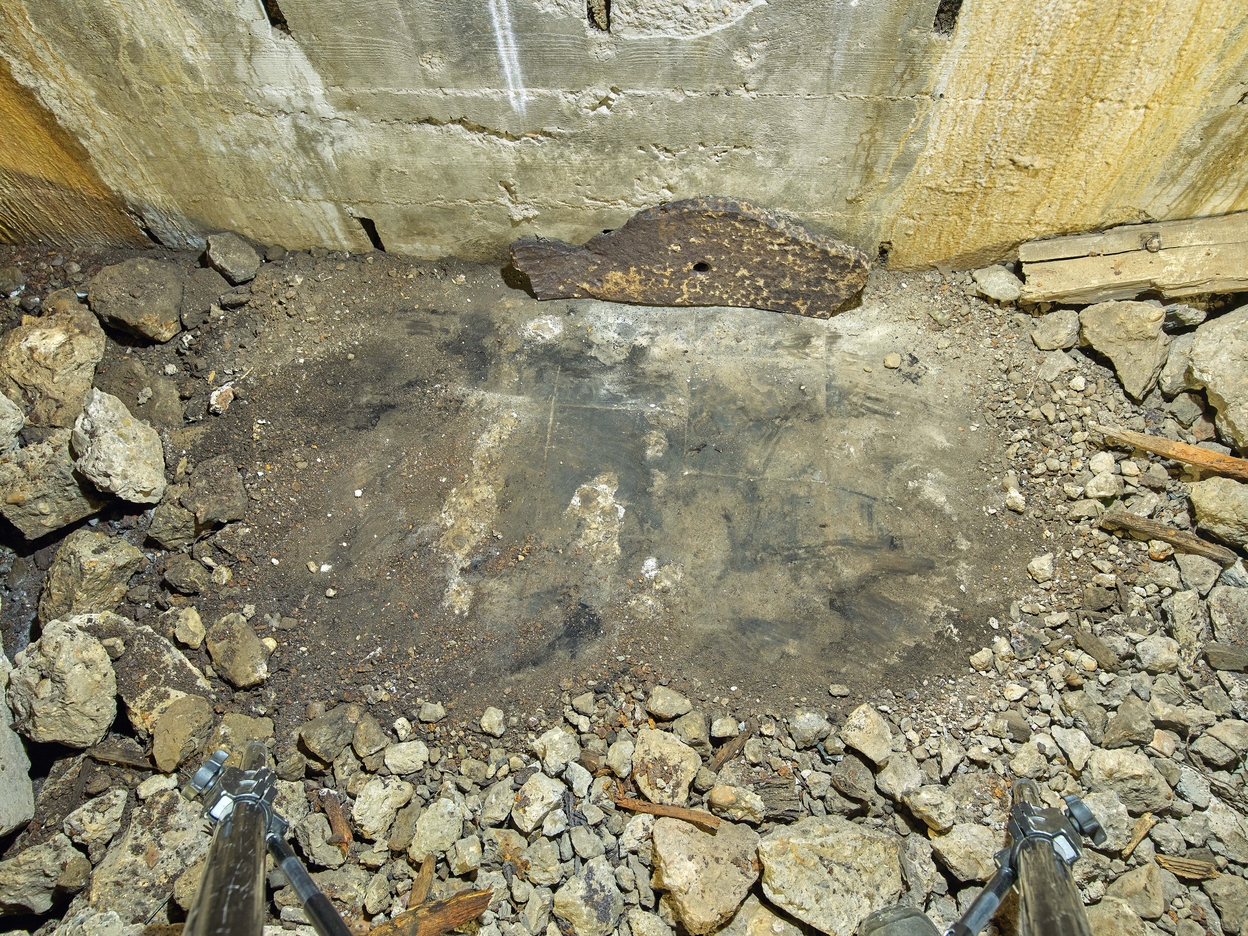 Vue de la pièce de vie - chambrée Nord : détail du sol d'origine sous les gravats de béton et éclats de projectilesImmatriculation