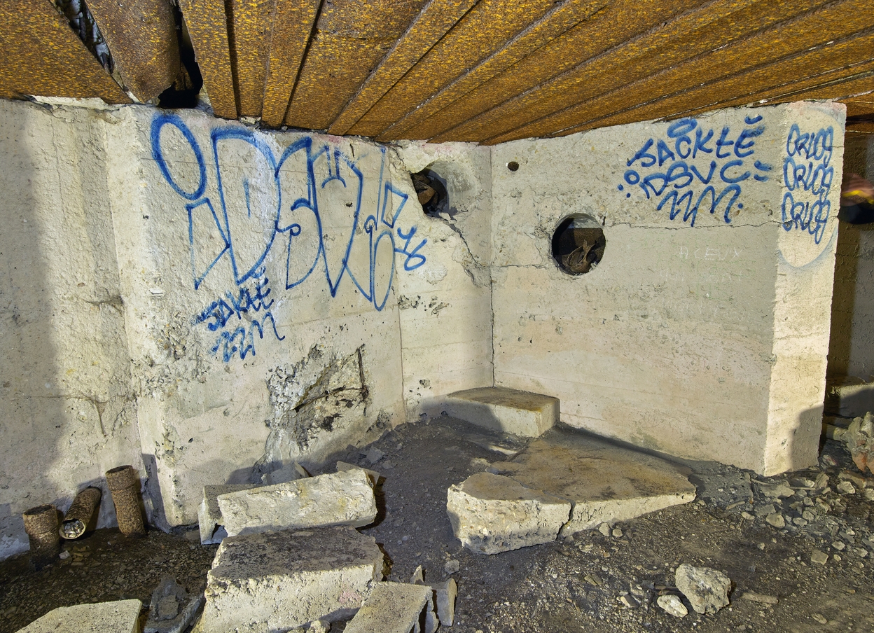 Vue de la chambre de tir : mur Ouest ; au sol à gauche, tuyaux de passage de câble ; au plafond, emplacements des bouches d'aspiration des fumées de tir ; au centre : tuyaux du système d'aspiration et d'évacuation (le ventilateur a disparu)Immatriculation