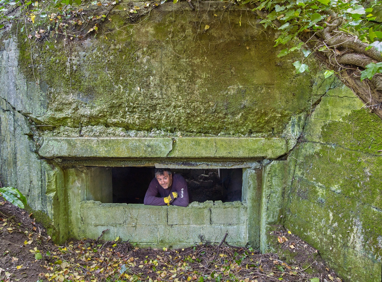 Vue de l'embrasure rectangulaire (partiellement murée par des parpaings). La dalle de couverture mesure 2 m d'épiasseur. A droite, le mur de flanquement Est. Sur cette photographie, Guillaume Lécuillier, chargé d'études Inventaire du patrimoineImmatriculation
