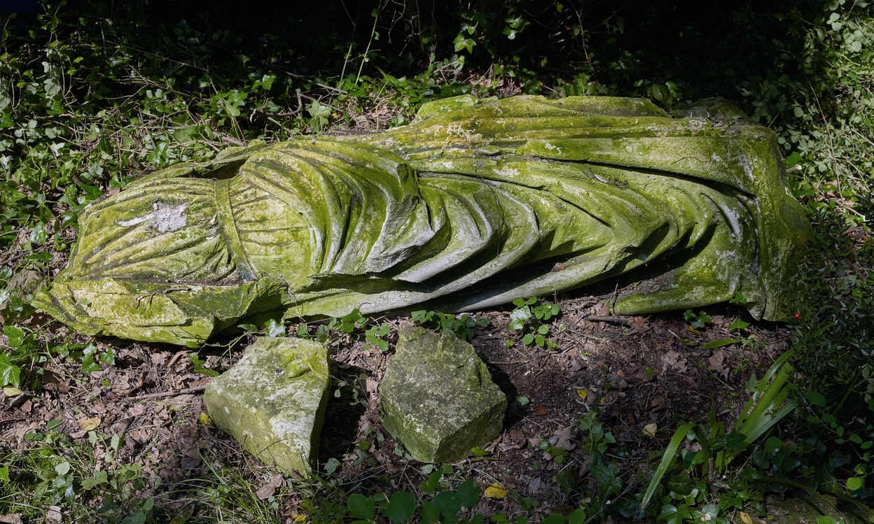 Vue de l'une des statues du jardin d'agrément. Couchée sur le sol près de la porte ornementale basse, son socle se trouve à proximité immédiate. Elle a perdu sa tête et l'extrémité de ses piedsImmatriculation
