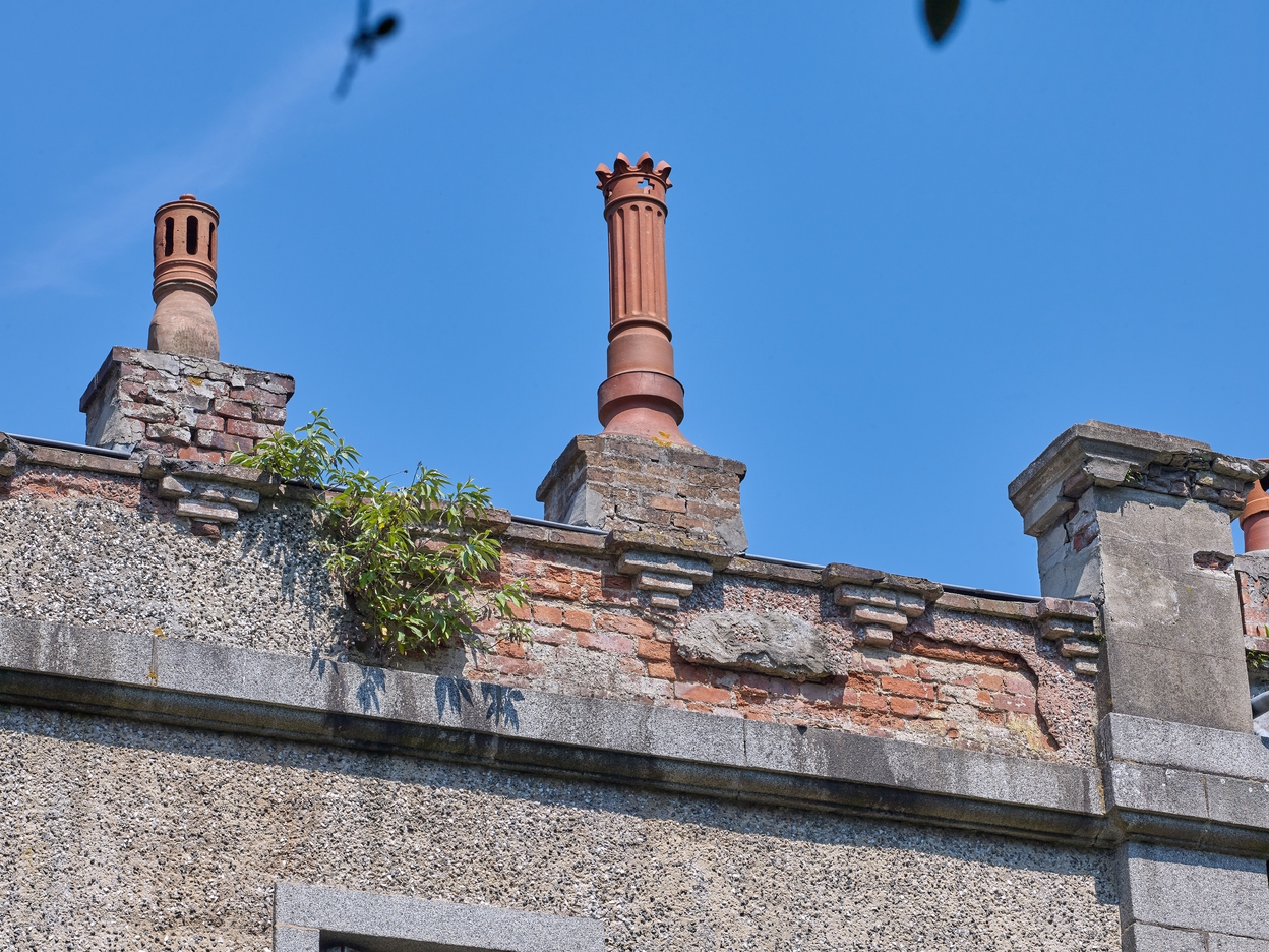 Vue de l'élévation Sud-est : des consoles en pyramide inversée ornent la partie sommitale ; les souches de cheminées en terre cuite sont particulièrement soignéesImmatriculation