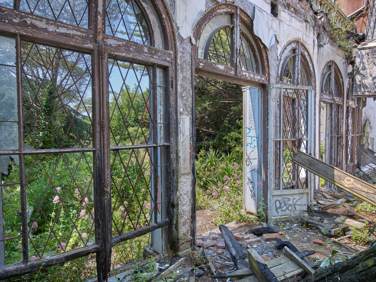 Vue intérieure : grande salle côté Sud-Ouest, vestiges des huisseries, portes-fenêtres en arc plein cintre et vitraux. Sur le mur, papier peint aux motifs florauxImmatriculation