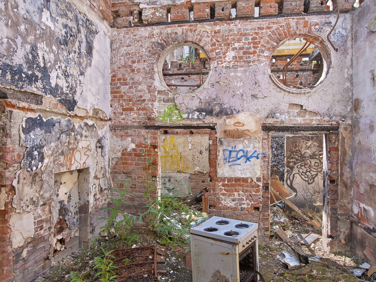 Vue intérieure : deux œils-de-bœuf de forme circulaire donnaient de la lumière en demi-jour à une pièce de service. Les murs intérieurs sont en brique enduit de plâtre avec linteaux en boisImmatriculation