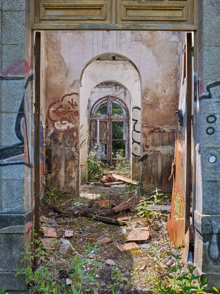 Vue de l'entrée principale (aménagée au centre de l'élévation Nord-est) et des murs de refend du Nord-est vers le Sud-OuestImmatriculation