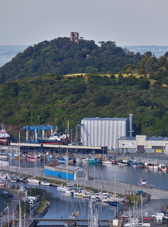 Vue de situation depuis le pont de la route nationale n° 12 franchissant le Légué. Au premier plan, le port du Légué ; à l'arrière-plan, la Tour de Cesson qui émerge de la cime des arbres. On apperçoit également le belvédère crénelé dit Tour MalakoffImmatriculation