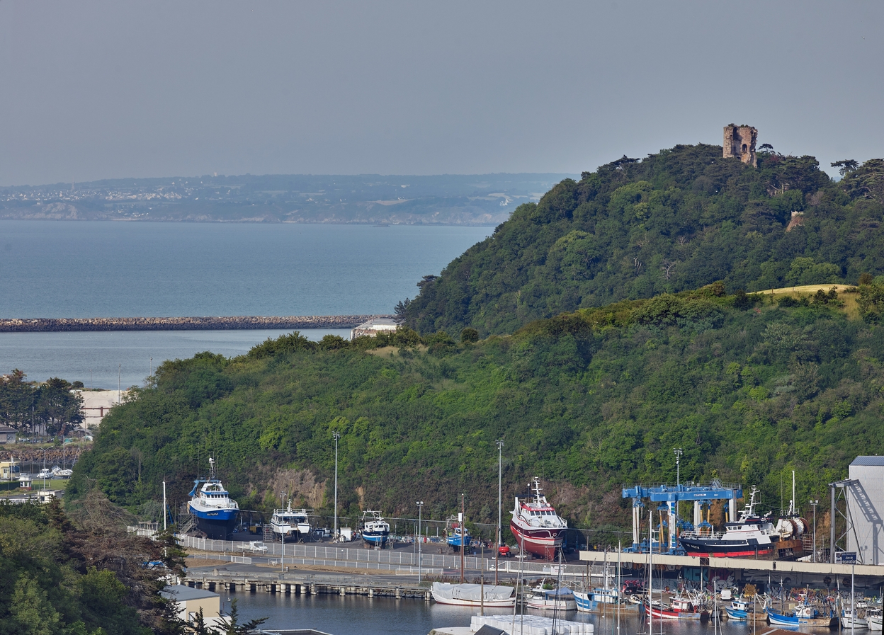 Vue de situation depuis le pont de la route nationale n° 12 franchissant le Légué. Au premier plan, le port du Légué avec des bateaux de pêche à sec ; à l'arrière-plan à droite, la Tour de Cesson qui émerge de la cime des arbresImmatriculation