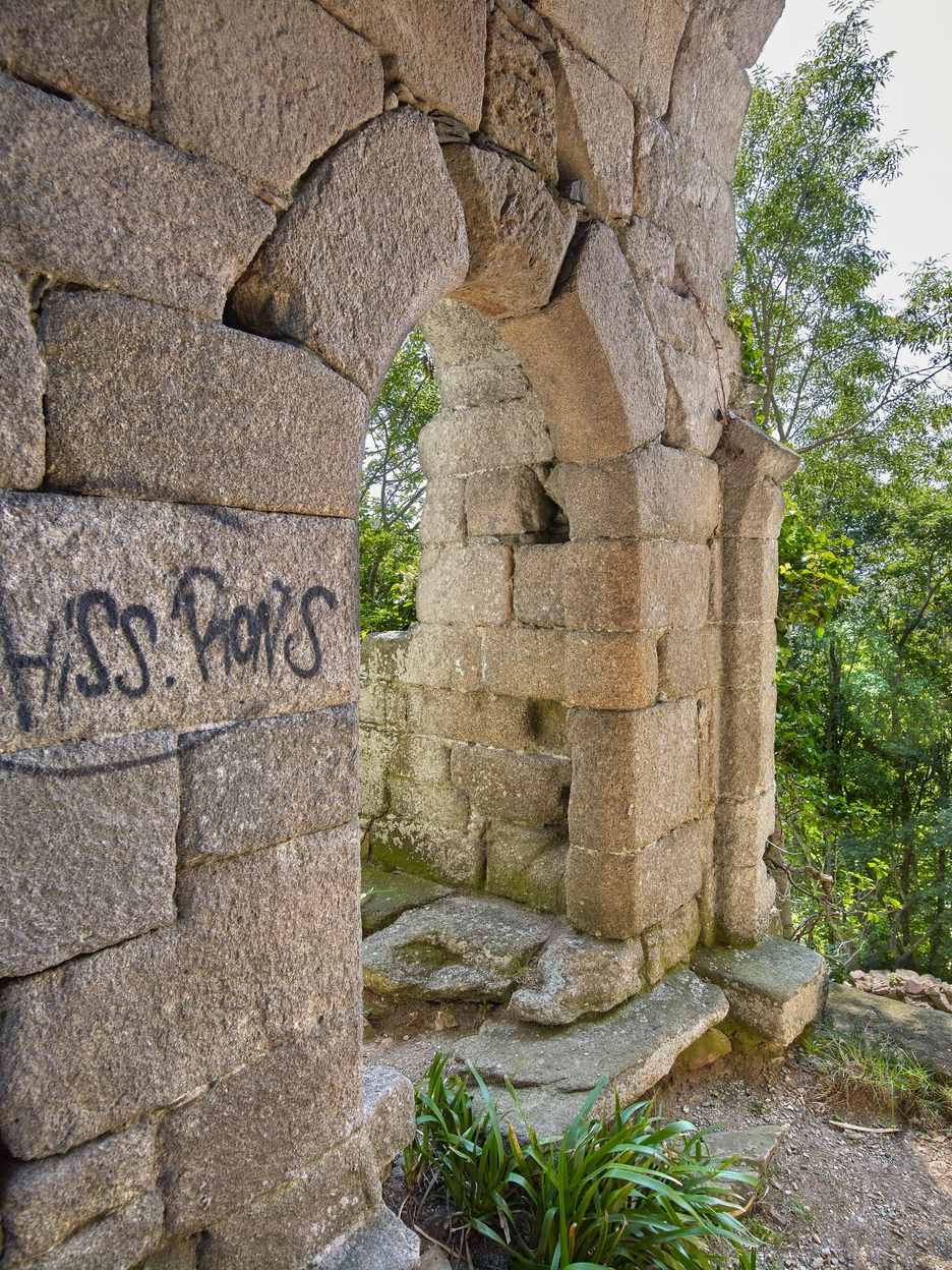 Vue du rez-de-chaussée surélevé : porte en arc plein cintre située entre le passage d'entrée du pont-levis et l'escalier en vis. A droite, départ d'un arc de porteImmatriculation