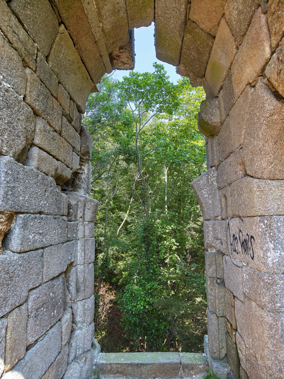 Vue du passage d'entrée du pont-levis. On voit le départ de la porte d'entrée (vraisemblablement en arc brisé) et de part et d'autre des piédroits moulurés, différents dispositifs de fermeture. L'ensemble est monté en pierre de taille de graniteImmatriculation