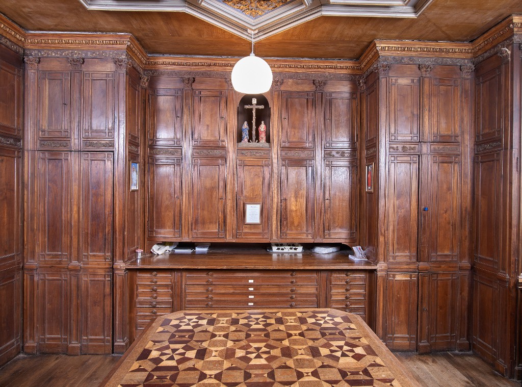 Sacristie : premier niveau, mur ouest, boiseries et table en marqueterieImmatriculation