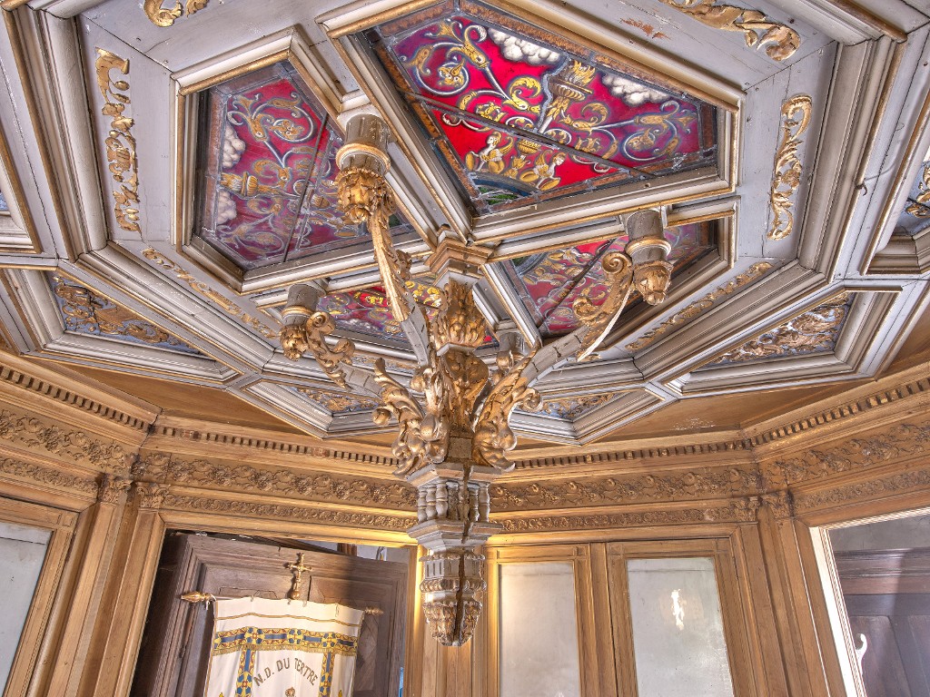 Sacristie, 2e niveau : éclairage zénithal inséré dans un plafond à caissons et orné de vitraux néo-renaissance ainsi que d'une clef pendante en boisImmatriculation