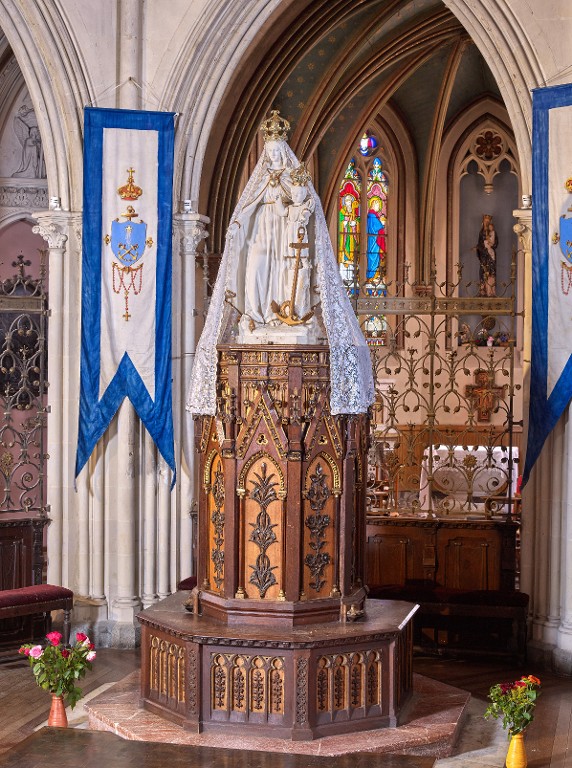 Vue de la statue dans son environnement, placée dans le chœur, sur un socle néo-gothiqueImmatriculation