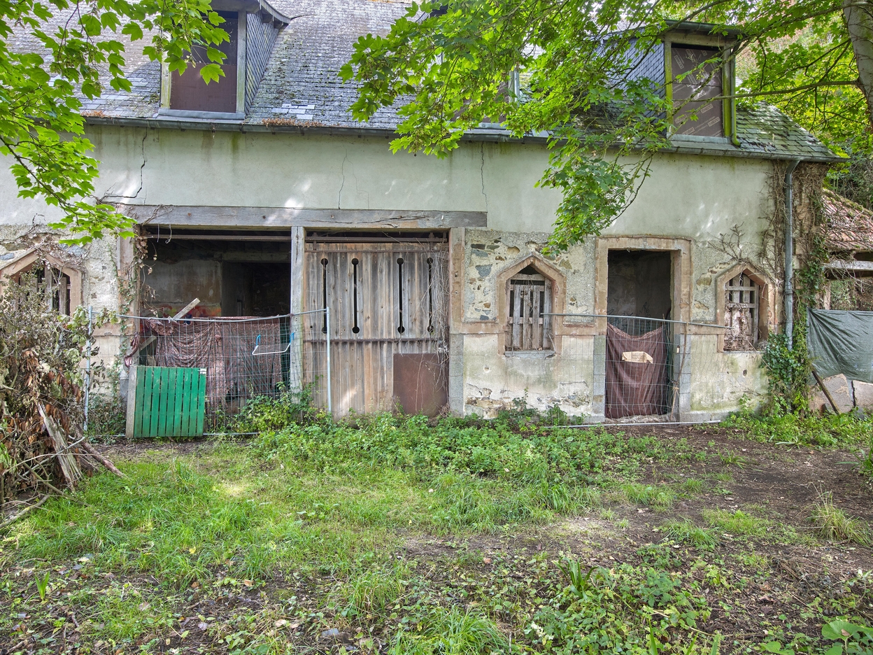 Vue des communs et dépendances : élévation sud. Remise à poteau de bois encadrée par les écuries. A signaler, la porte ajourée en bois de la remise ; le comble à surcroît éclairé par des lucarnesImmatriculation