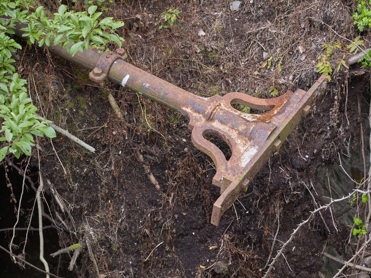 Vue de la serre située au Sud : en équilibre au rez-de-chaussée (le plancher du rez-de-chaussée s'est effondré), poteau métallique ouvragéImmatriculation
