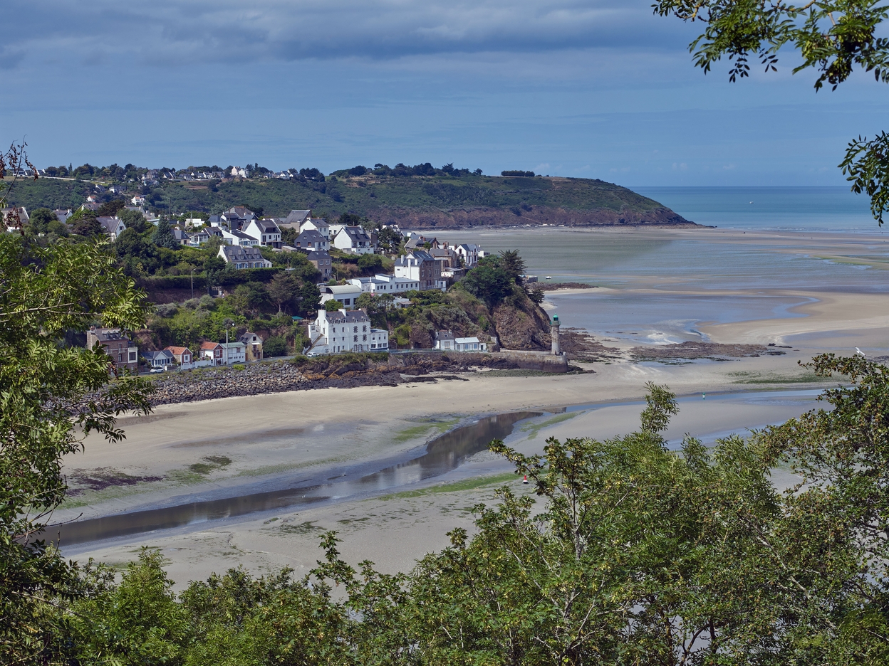Vue du panorama de tir depuis la dalle de couverture du bunker - casemate de type 612 pour un canon de campagne ou obusier de 7,62 cm ou 10,5 cm. Au premier plan à l'embouchure du Gouët (sur la rive opposée, côté Plérin), le phare de la Pointe-à-l'Aigle. En arrière-plan, la Plage de Saint-Laurent et la Pointe du RoselierImmatriculation