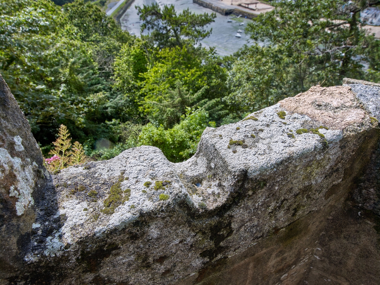 Vue du belvédère de jardin dit Tour Malakoff : détail de la guérite dans le style néo-gothique (le trou dans la pierre de taille permettait de fixer un canon d'apparat)Immatriculation