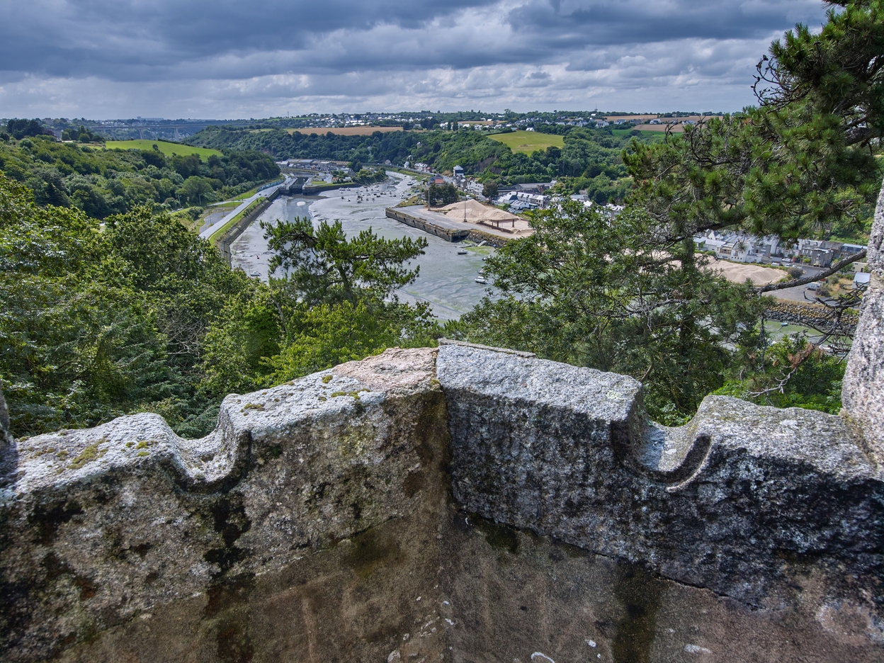 Vue du belvédère de jardin dit Tour Malakoff : détail de la guérite dans le style néo-gothique (le trou dans la pierre de taille permettait de fixer un canon d'apparat)Immatriculation