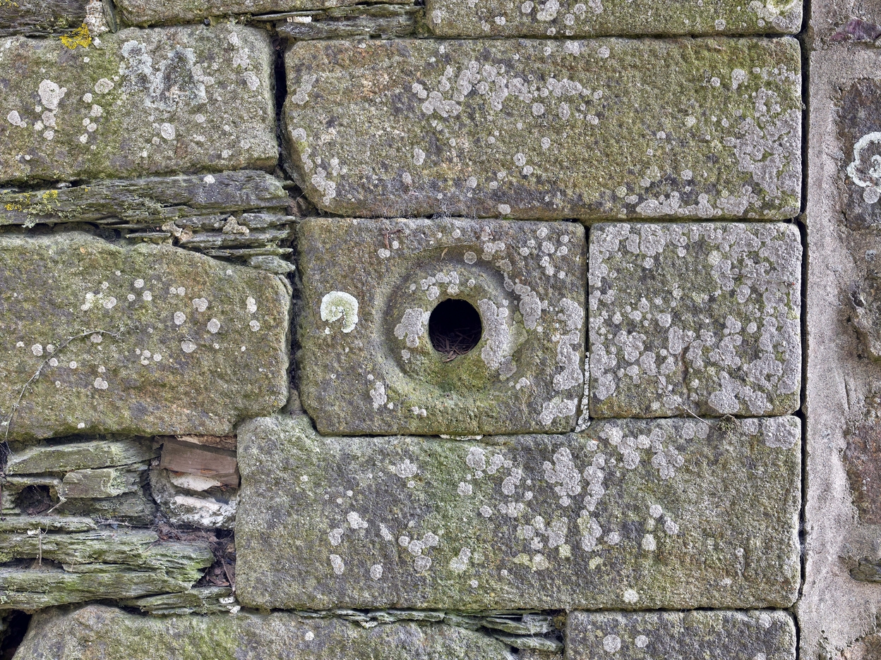 Portail d'entrée flanqué d'une petite ouverture de tir. Détail de l'ouverture de tirImmatriculation