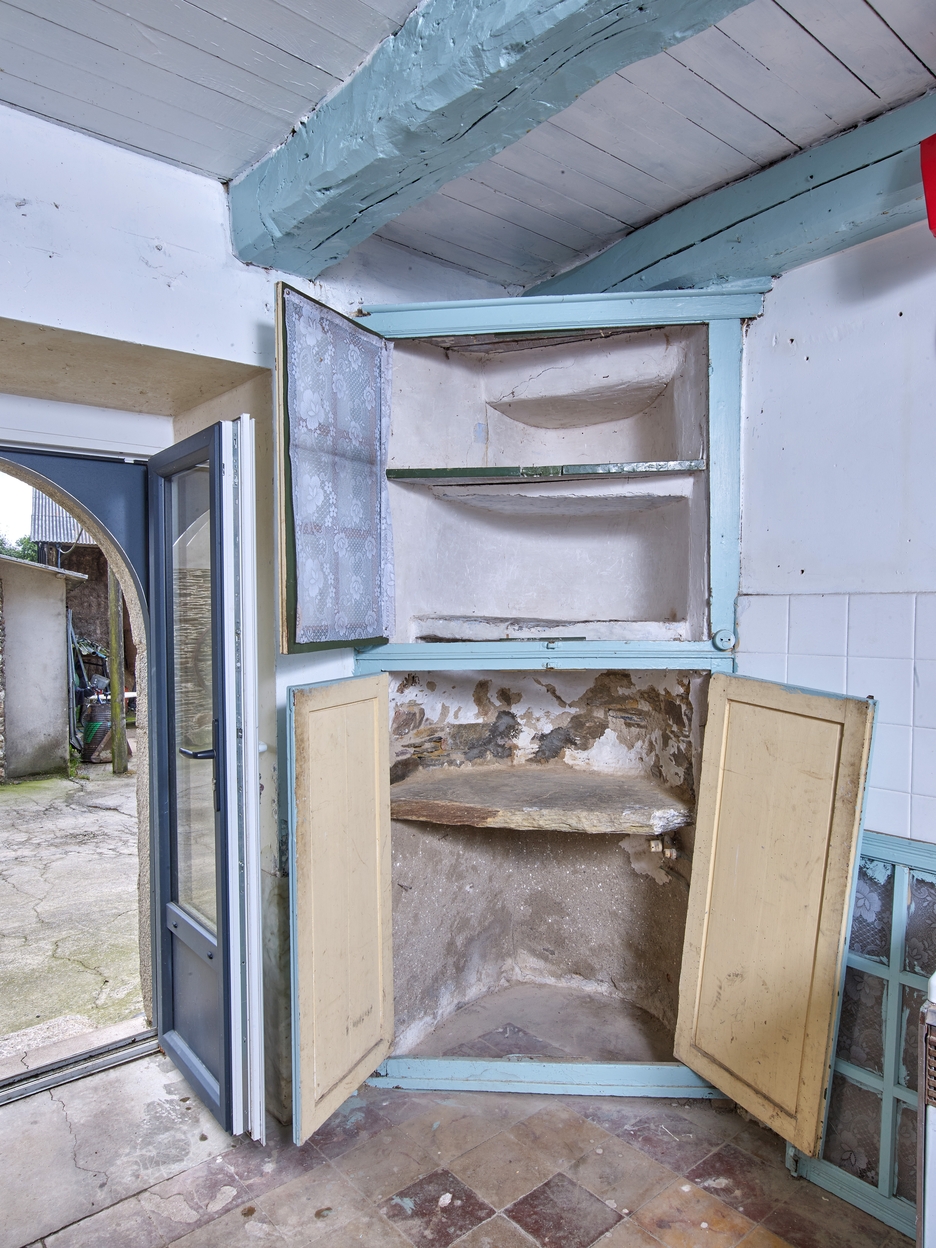 Logis 1673. Salle, angle sud-ouest près de la porte d'entrée. Emplacement du saloir surmonté d'étagères en dalles de schisteImmatriculation