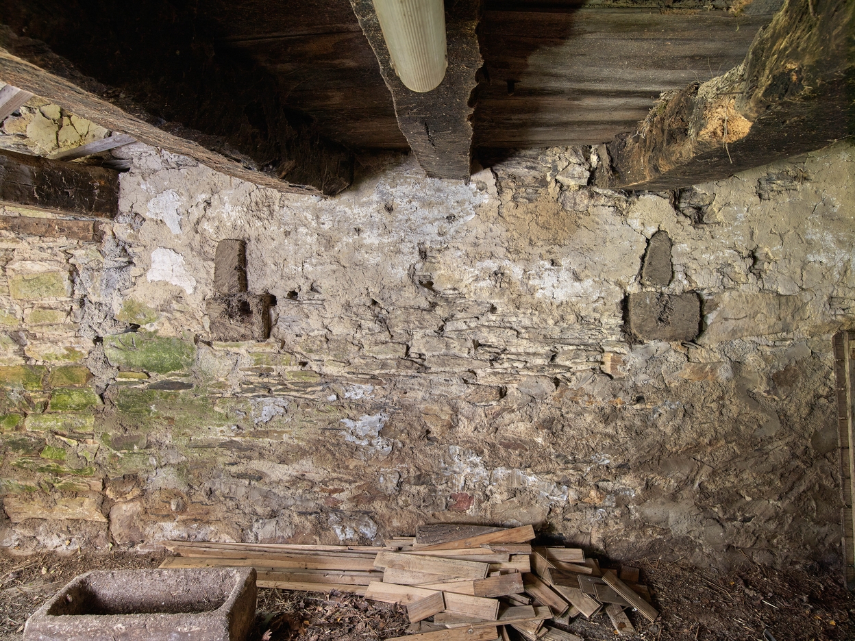 Logis à pièce unique. Pignon est. Détail de l'assemblage en bois de la cheminée voisineImmatriculation