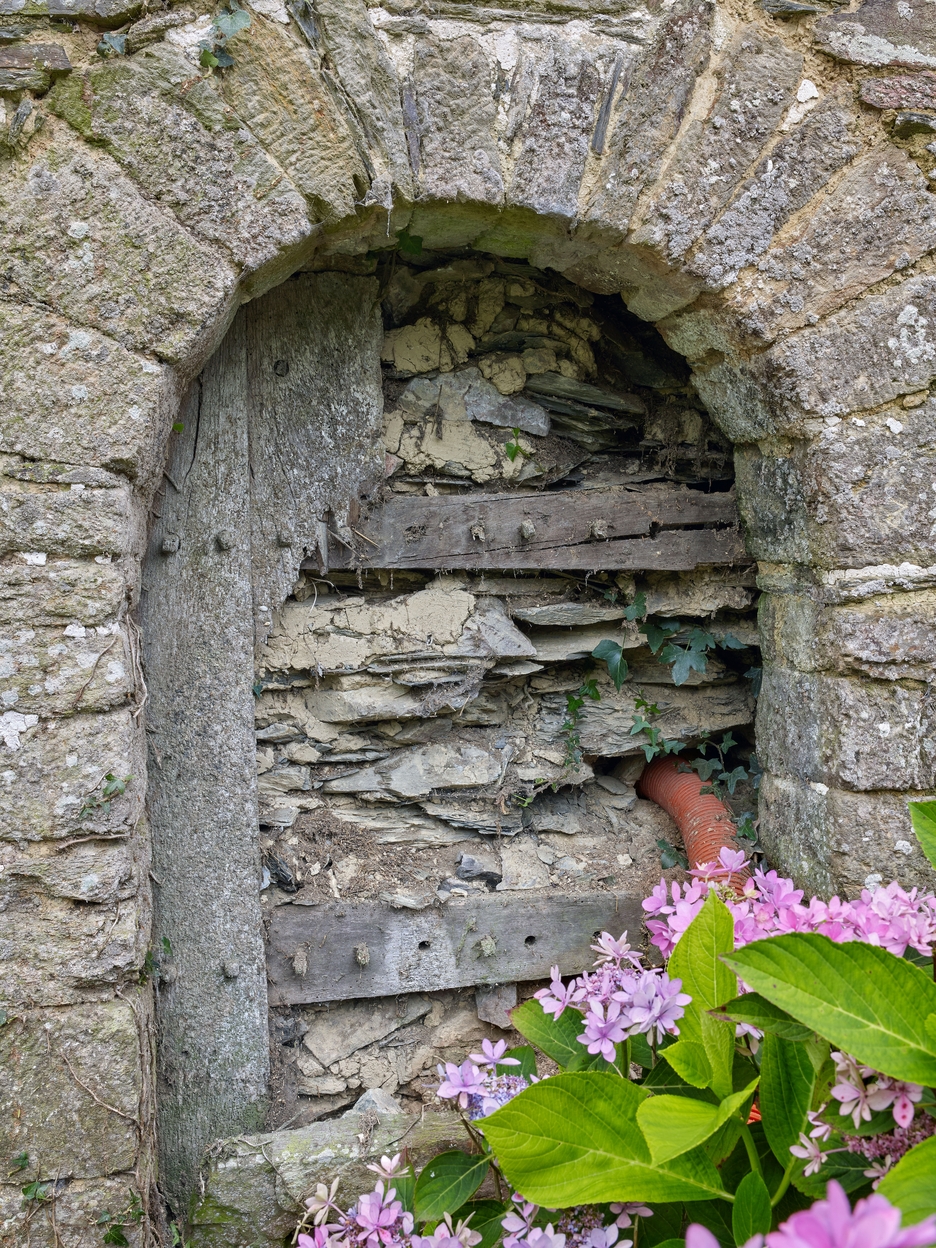Logis 17e siècle. Elévation nord. Porte cintrée de l'étable, à claveaux de schiste, avec les vestiges de l'huisserie d'origineImmatriculation