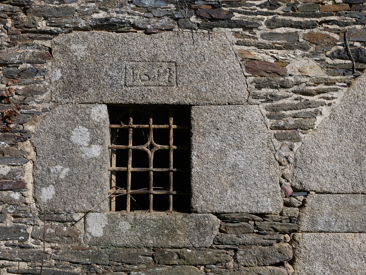 Logis 1651. Elévation sud. Détail de la fenêtre à grille de la salle datée 1651Immatriculation