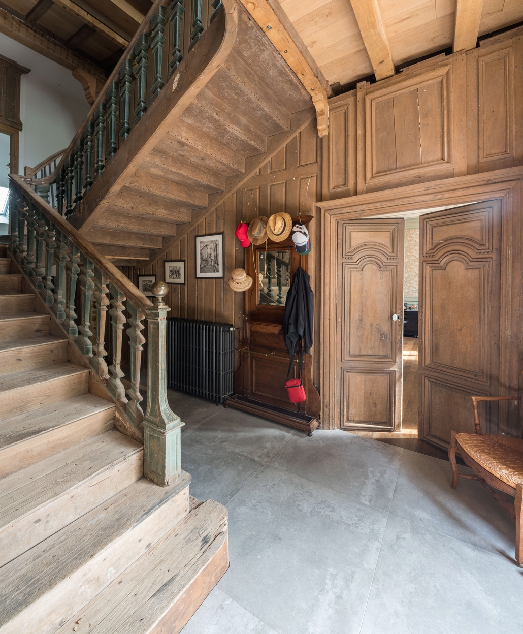 Logis, vestibule d'entrée, escalier, cloison en menuiserie et porte du salon à double battantsImmatriculation