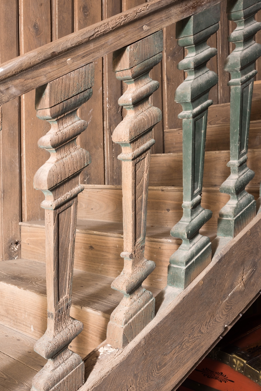 Logis, vestibule d'entrée, escalier, détail des balustres qui soutiennent la main couranteImmatriculation