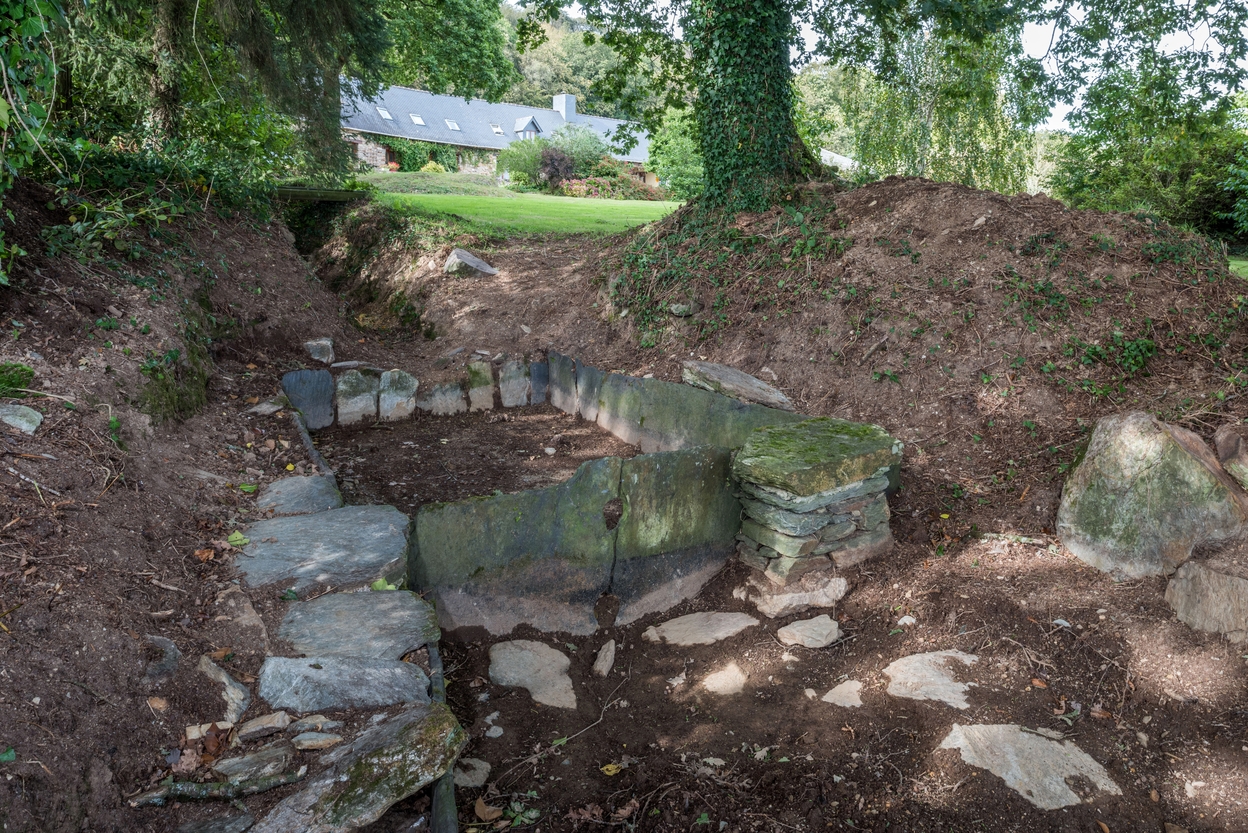 Ferme-blanchisserie. Lavoir dit doué. Premier bassin et vestiges du second bassin. Pilier carré en moellon destiné à bloquer le palis lorsque le premier bassin est plein. Vue générale sudImmatriculation